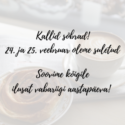24. ja 25 veebruar oleme suletud (1) Published 20. veebr. 2023 at 1080 × 1080 in 24. ja 25 veebruar oleme suletud (1) ← Previous Next →